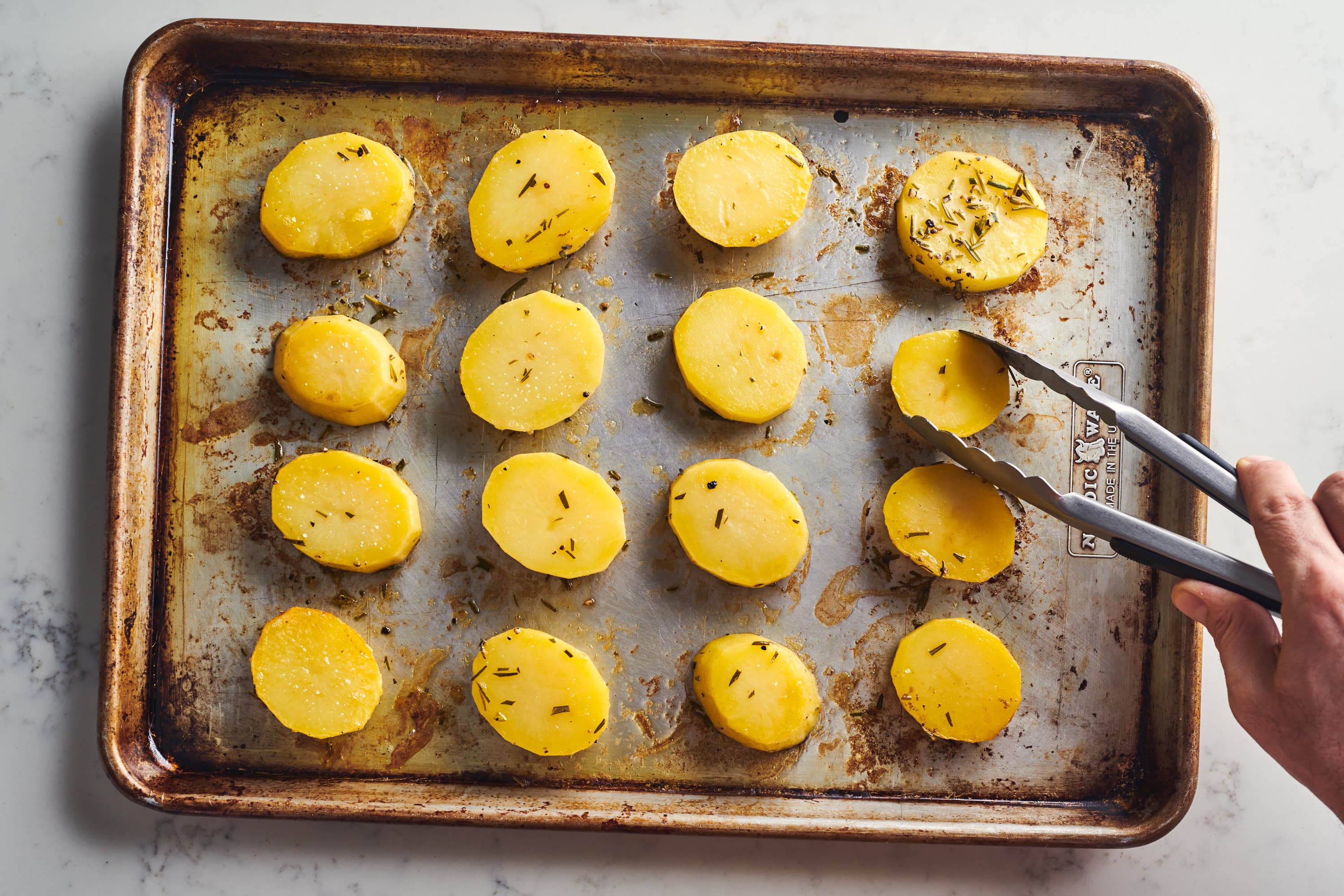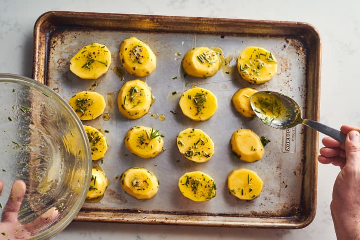 These potatoes are roasted in a butter and herb mixture for a crispy outside, and then chicken broth is added towards the end of cooking to make the insides soft and tender.